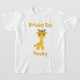 A customized giraffe themed birthday boy white t-shirt, this item is so cool. A giraffe is pictured in the center with "Birthday Boy" written in fun brown font. Underneath is a customized name.