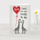 This Valentine’s Day greeting card features two cartoon giraffes standing at the bottom of the card, facing each other with their long necks gently curving until their noses touch. Their black-and-white bodies are decorated with simple spots, and small red hearts rest on top of their heads, showing affection. The background is a light gray with soft horizontal stripes that keep attention on the pair. Above them floats a red heart-shaped balloon with the word “love” written in cursive, its thin string drifting down toward the giraffes. Along the right side, the message reads “Love your neck CLOSE to ME,” with “CLOSE” in bold capital letters for emphasis. The scene feels sweet and romantic with a touch of humor, making it a lovely way to share Valentine’s Day feelings with someone special. ❤️