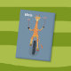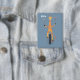 Fun blue rectangular button for kids to collect , featuring a giraffe on a unicycle , also balancing spinning plates on two sticks . Personalize it with the child's name if you wish .