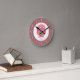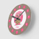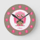 A clock for teachers featuring an illustration of a pink owl with a giraffe print stomach. Clock features white numbers on pink dots.