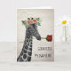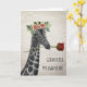 A valentine's card featuring a black and white image of a giraffe with flower crown holding a red rose in its mouth over a white brick background. Text says, "Giraffeter my own heart."