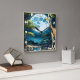 A giraffe stands gracefully beside a calm water body, illuminated by the bright full moon and surrounded by lush trees in a serene twilight setting
