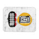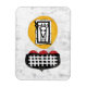 Cute striped giraffe drawing over a yellow circular shape. Below the giraffe lies a black endpiece with white crisscross pattern and red scallop trim.