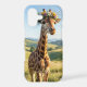 A charming giraffe wearing a crown of colorful flowers stands in a sunlit field, with serene rolling hills in the background