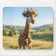 A charming giraffe wearing a crown of colorful flowers stands in a sunlit field, with serene rolling hills in the background