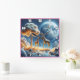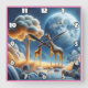 Two majestic giraffes stand beside a tranquil waterway, illuminated by a glowing moon. Surrounding them are soft clouds and a silvery landscape, creating a magical, peaceful atmosphere.