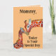 Sweet picture of a mama giraffe and her baby, rubbing noses, is featured on this Mother's Day greeting card. Front of card reads, "Mommy, Today Is Your Special Day.", and inside of card reads, "Thank-you for taking care of me and for all your Love. Happy Mother's Day!". A wonderful card for a small child to give Mom on Mother's Day!