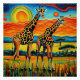 A.I. created interpretation of two vibrantly colored giraffes stand prominently against a backdrop of a stylized African Savannah under a swirling sky with multiple sun-like orbs. The scene is painted in a whimsical, surreal style, with exaggerated features and bold, contrasting colors.