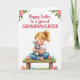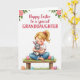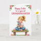 This card shows a golden-haired young girl with a high ponytail tied by a rosy band, sitting close on a rustic wooden bench topped with a small patch of green grass. Her eyes are gently closed and her cheeks are lightly pink, giving her a tender, affectionate look as she cuddles a fluffy gray bunny 🐰. The bunny rests calmly in her arms with big warm brown eyes, leaning into her as if it trusts her completely. Above them, a special greeting is placed across the upper area in a soft pastel color, leaving plenty of airy white space around the words. Small flowers and leafy accents sit near the text like a light spring border 🌷. Around the bench and grass are scattered decorated egg shapes with polka dots and stripes in pink, teal, orange, and lavender. The background stays bright white, making the pastel decorations and the girl’s rosy hair tie stand out clearly.