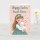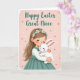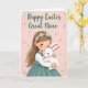 This card shows a young, stylized girl with closed eyes and a small, content smile as she hugs a fluffy white rabbit close to her cheek 🐰. Her long brown hair flows softly, topped with a slim headband decorated with tiny pink and teal flowers that echo the springtime mood 🌷. She wears a teal pinafore over a white long-sleeved shirt, and the rabbit’s rounded shape and gentle posture suggest a quiet bond between them. Both faces have a light rosy blush and fine lashes, adding to the tender, affectionate look. The background is a muted salmon pink with scattered, uneven polka dots in white and deeper rose, giving the scene an airy, cozy setting. Near the top, a short Easter greeting sits centered in deep teal lettering, standing out clearly against the pale backdrop. Soft, diffused lighting keeps the colors pastel and the edges smooth, with the girl’s arms wrapping around the rabbit while the dots drift behind them in loose rows.