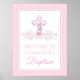 Girl baptism sign with pretty pink cross on a pink and white background. This pink cross baptism sign is easily customized for use as a christening, first communion or confirmation sign by simply adding your details.