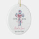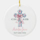 Beautiful baby girl baptism ceramic ornament with a pink and blue religious cross with a bow and the message "god bless". Personalized with her name and the year she was baptized. Double-sided design. Ideal newborn keepsake for the Holidays.