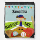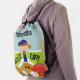 Girl batter Up Baseball personalized drawstring backpack bag features a cute little brown haired girl with a red and blue baseball cap and glove on the baseball field, a helmet, bat, baseball glove, baseball, and baseball cap, flag banner, and text that reads Batter Up! You can easily add her name before ordering to personalize it!