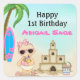 This cute beach Happy 1st Birthday sticker design for girls features a cute beach baby sipping her lemon aid. She is standing with her impressive sandcastle and surfboard. It can be personalized with a name and any text that you wish to add. Some graphics by artwork©delightful-doodles.com and CherylSeslarDesigns.com at DigiWebStudio.com.