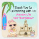 This cute beach first birthday Thank You sticker design for girls features a cute beach baby sipping her lemon aid. She is standing with her impressive sandcastle and surfboard. Some graphics by artwork©delightful-doodles.com and CherylSeslarDesigns.com at DigiWebStudio.com.