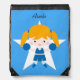 Girl Cheerleader Blue Uniform drawstring backpack bag, a fun, a colorful design girls who love cheering are sure to love, features a little girl with blond hair in a blue cheering uniform with blue pom poms on a white star with a bright blue background and an area you can add her name to personalize it!