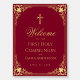 The background is burgundy. It has a vintage ornate frame with faux gold foil decorations in the corners. Above the text there is a faux gold cross. The word Welcome is written in an elegant calligraphic script, the rest in caps. All text can be personalized and has a golden color similar to the frame.