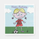 Little girl in football uniform playing with football in front of goal, ideal accessory for a birthday girl’s party