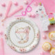 Fox baby shower paper plates with adorable baby girl fox on a beautiful pink and gold floral background. These cute girl fox baby shower paper plates are easily customized with text.
