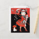 Black, red and white drawing of a little girl looking over her shoulder wearing a red coat, fishnet stockings, high heels and a fancy hat. Drawing by Italian cartoonist Antonio Rubino for the cover of the children’s magazine, “Il giornalino della Domenica”,1909.