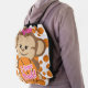 A cute brown smiling girl monkey with pink bow holds an orange basketball with pink outlined text that reads I Love Dad on a drawstring backpack she's sure to love! The bag background is white with lots of various size basketballs!