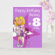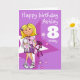 Cute kids modern graphic personalized girl with blond hair birthday card in purple shades. Customize with your own choice of name and age, currently reads Happy Birthday Ashley 8 today. Uniquely designed and illustrated by Sarah Trett.