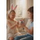 Cute Girl with Rabbit Ears Photo (generative content), she is going to the Egg Hunt, she is in the garden Easter decorated. On the other side, humor text in a funny form, saying "Happy Eggster Day!"