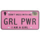 This awesome custom license plate features a faux 3D raised lettering look. In the sticker corners are a raised fist and a "sticker" with the symbol for woman and the year 2020.