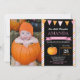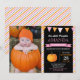 Girl Pumpkin Birthday Invitation with custom photo. Little Pumpkin Fall Birthday Invite. 1st First Birthday. Orange and pink stripes, chalkboard background. For further customization, please click the "Customize it" button and use our design tool to modify this template.