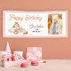 This charming pumpkin patch photo birthday banner features a delightful mix of orange, white and pink pumpkins, adorned with sweet little bows. Say "Happy Birthday" to the birthday girl with this banner, perfect for a young girl's fall birthday celebration.