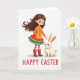 This design shows a young girl and a small bunny 🐰 sharing a gentle moment on a white background that keeps all the colors in focus. The girl stands centered with long brown hair, rosy cheeks, and bright eyes, and her soft smile feels like a friendly invitation. She wears an orange coat-dress with dark buttons over a ruffled skirt filled with reds, yellows, blues, and greens, like a cheerful swirl of confetti. Red-and-white striped socks lead down to shiny red rain boots, giving her the look of someone ready for a sweet springtime stroll 🌷. At her side, a creamy white rabbit with pink inner ears and a faint blush faces forward, calm and trusting. Her open hand reaches toward the bunny, as if offering a greeting that reads like quiet friendship. The words “HAPPY EASTER” sit along the bottom in large red letters beneath their feet.