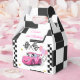 Send your little racers home with these girl racing birthday favor boxes! Featuring a pink race car, sparkling gold stars, and a classic black and white checkered flag border, these boxes are perfect for holding treats, small toys, or party favors.