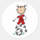 A girl soccer player in a red uniform kicks the soccer ball on soccer T-shirts, cards, tote bags, mugs, and other soccer apparel and gift items that you can add a name to!