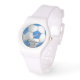 Blue and white soccer ball watch for a girl soccer player, with a place for her name in black script. This is the perfect custom gift for a young girl or teen. The band color can be changed from pink to red or white, or change the look of the watch completely.
