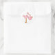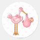 Pink baby design for baby girl featuring stork carrying baby girl on pink heart background. Great envelope seal for baby shower invitations or birth announcements.