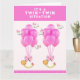 Creative twin girls congrats card featuring baby twin girls and pink balloons.
