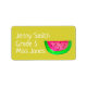 Cute girly colorful watermlon fruit themed book labels or school item sticker labels for young school kids. This design features a cute watermelon fruit cartoon against a customisable background. The text is fully customisable to include own name and class details.