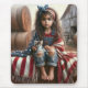 Cute little girl sitting on a hay bale with an American flag and kitten