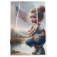 Cute little girl wearing ripped bib overalls and her hand is over her heart.