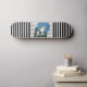 A cool skateboard with bold and modern black & white stripes, a cool gingham pattern and a girl comic character with a tablet in her hands with a peace symbol sticker on it.