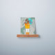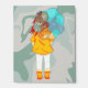 Girl with Umbrella Drawing in the Wind Picture Ledge. This drawing portrays a girl standing in the wind, her back turned towards the viewer. She is holding an umbrella. The girl's hair is being blown in the wind. The background is a green swirl.