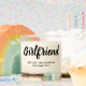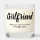 Surprise your girlfriend with a meaningful and personalized gift that will touch her heart. Our scented personalized message candle features modern black script typography, making it a stylish addition to any décor. With easy personalization, you can create a special message just for her. Perfect for any occasion, this candle is the perfect way to show your girlfriend how much you care.