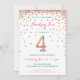 Celebrate your 4 year old's birthday with colorful gold, pink, mint and teal confetti on these 4th birthday invitations! Featuring your daughter's party details and a "4" in confetti. Title reads "HIP HIP HOORAY!" Cute colorful matching stripes on the back.