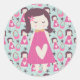 Cute, fun, whimsical, colorful design on items including wallets, watches, cards, stickers, drawstring bags, compact mirrors, key chains, notebooks, postage, binders, pillows, and so much more, features little girls with pink heart dresses, pink and white polka dotted handbags, dark purple stars, and a blue chevron stripe background.