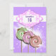 A modern meets vintage design of three candy cane lollipops in pastel pink, chocolate brown, pastel peppermint green, watermelon orange and white swirls pop against a pretty pale lavender purple background filled with stars and splatters. CUSTOMIZE IT: Change the wording to suit your special occasion; move the templates to any position preferred; change the color / style and size of the font and upload your own unique images. INVITATION SIZES: Choose from the different size invitations and the templates will automatically be applied to the one you choose. IDEAL FOR: Girls celebrating their sweet 16th with a candy corner theme. They are ideal for Bachelorette / bridal / quinceanera and wedding parties too.
