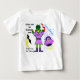 Cute alien robot girl. Personalize with Your Child's NAME. Fun White or Pink Tutu spaceship shirt with the wording, "Girls Can Be Captain Too, Exploring The Galaxy". My cartoon space robot and spaceship characters. Captain Zoey is a happy, green robot girl smiling and waving her hand hello, wearing a pink spacesuit dress with pointed hem and purple belt and space boots, with look of 3D light up buttons on wrists and collar and flower petals on belt and boots. Petals the Spaceship is pink and purple with a happy, smiling face on the right side with blue eyes and eyelashes, cute nose and red smiling mouth, and colorful flowers with flower accents, bottom of ship is black with blue dots, yellow beams of light underneath spaceship and back of ship has silver exhaust tubes, soaring into the galaxy of blue stars with yellow, black and red lightning bolts. Original Artwork Design © 2014 TamiraZDesigns.