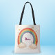This personalized tote bag features an attractive watercolor rainbow with glowing golden stars and fluffy clouds.