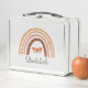 This girly boho chic lunch box design is mostly of neutral and earthy color scheme and features a muted rainbow with a butterfly. Back of lunch box has a blush beige pink colored background. It also comes with a customizable name. This item is ready to be personalized. For more, visit the store.