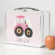 This cute and modern kids lunch box design features a whimsical pink farm tractor, with a tractor pattern background, and can be personalized with your girls name, and last name on the back. Perfect for tractor or farm-lovers! Check out our store for other cute pink farm-themed designs.