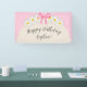 Daisy flower and pink bow birthday banner. 18 inch by 36 inches. This adorable pink floral design features white daisies with golden yellow centers and soft watercolor-style pink bows with a pastel pink background. This charming feminine aesthetic is perfect for a girly party. The daisy and bows create a playful cottagecore vibe that is both trendy and timeless. The sweetest modern birthday banner.